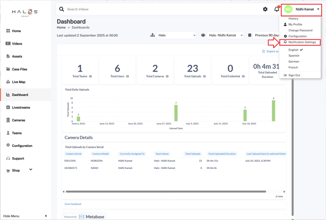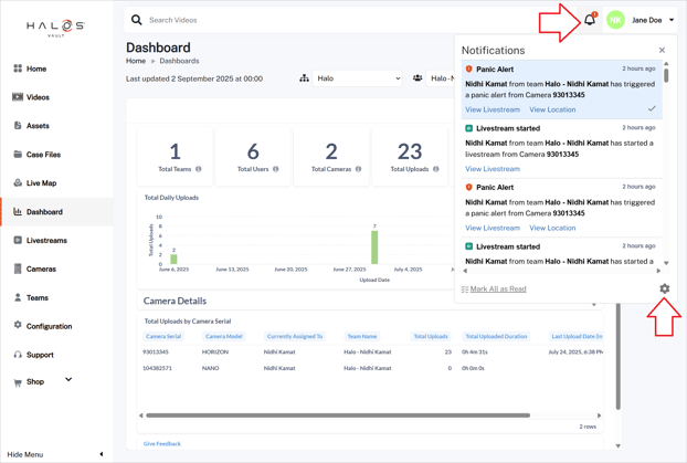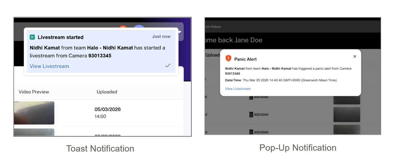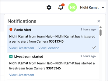- Panic Alerts: Get notified when a camera in your team triggers a panic alert