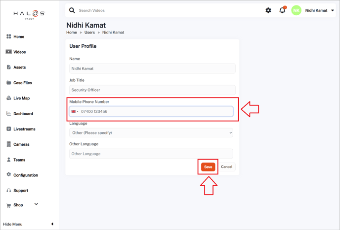 Before you can use SMS notifications, you need to add a valid mobile number to your profile:- Click your profile in Vault (top right) and select My Profile from the dropdown list