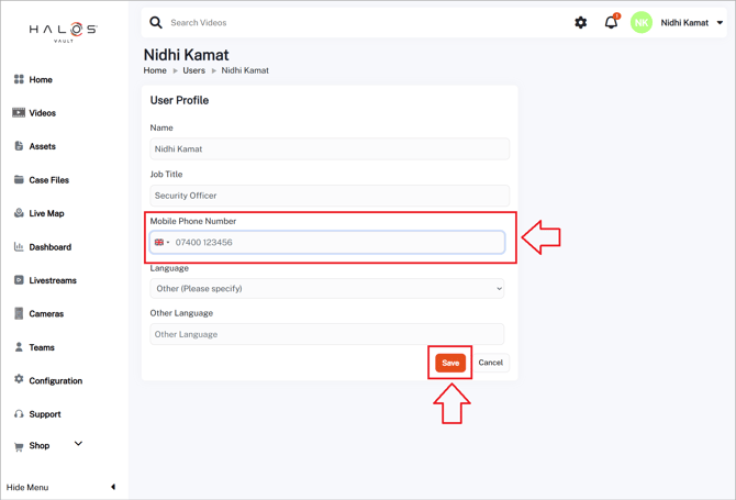 - Enter a valid mobile number and click Save